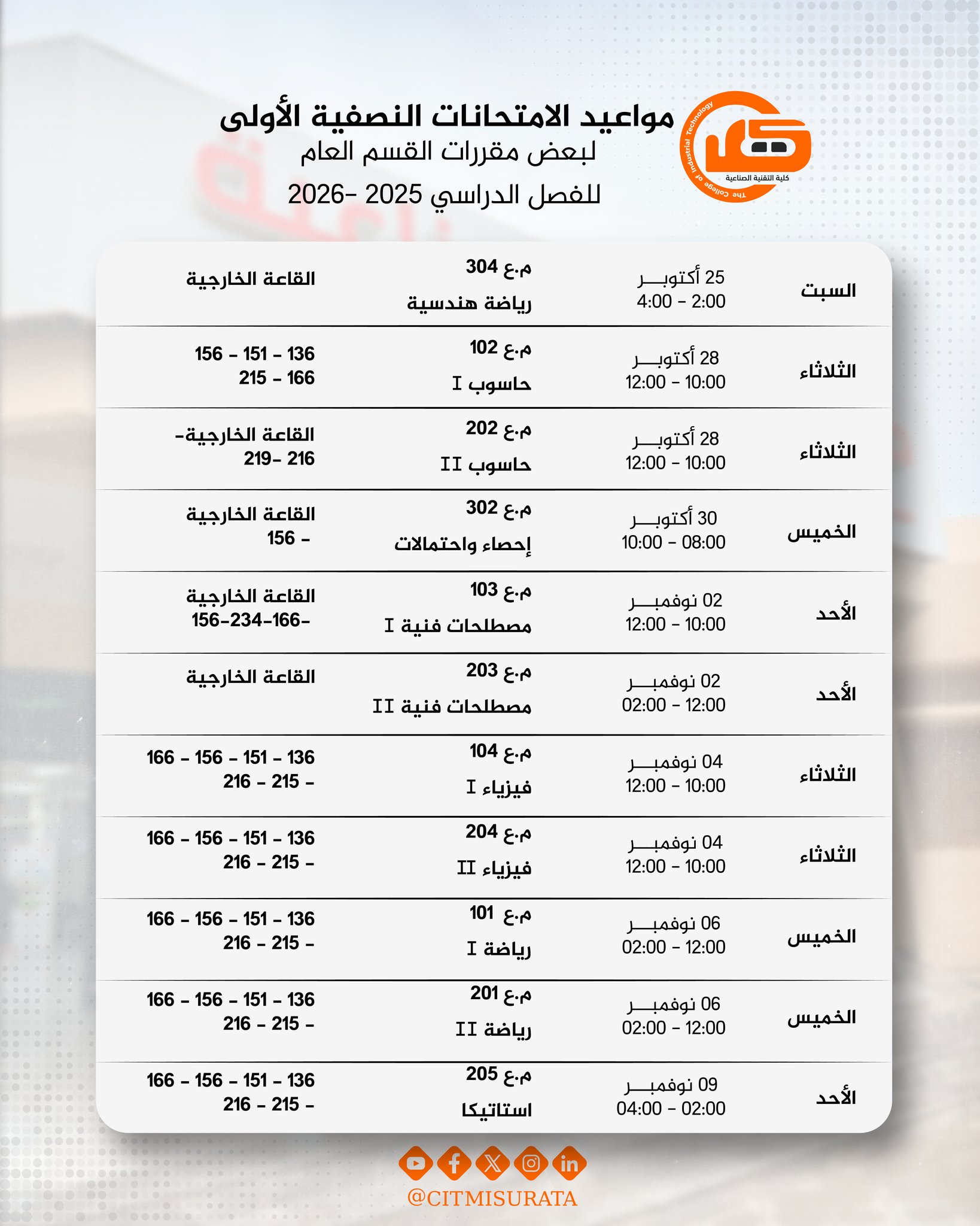 مواعيد الامتحانات النصفية الأولى للفصل الدراسي خريف 2025–2026م يُعلـن القسـم العـام عن جدول الامتحانات النصفية الأولى لعدد من المقررات الدراسية، حيث تُقام الامتحانات في القاعات الموضحة بالجدول، ووفق التوقيت المحدد لكل مادة. يرجى من جميع الطلبة: الالتزام بالحضور في الموعد المحدد. التحقق من القاعة ووقت الامتحان لكل مقرر . لمزيد من التفاصيل، يمكنكم الرجوع إلى لوحة الإعلانات بالقسم العام أو التواصل مع القسم. مع تمنياتنا للجميع بالتوفيق والنجاح.
