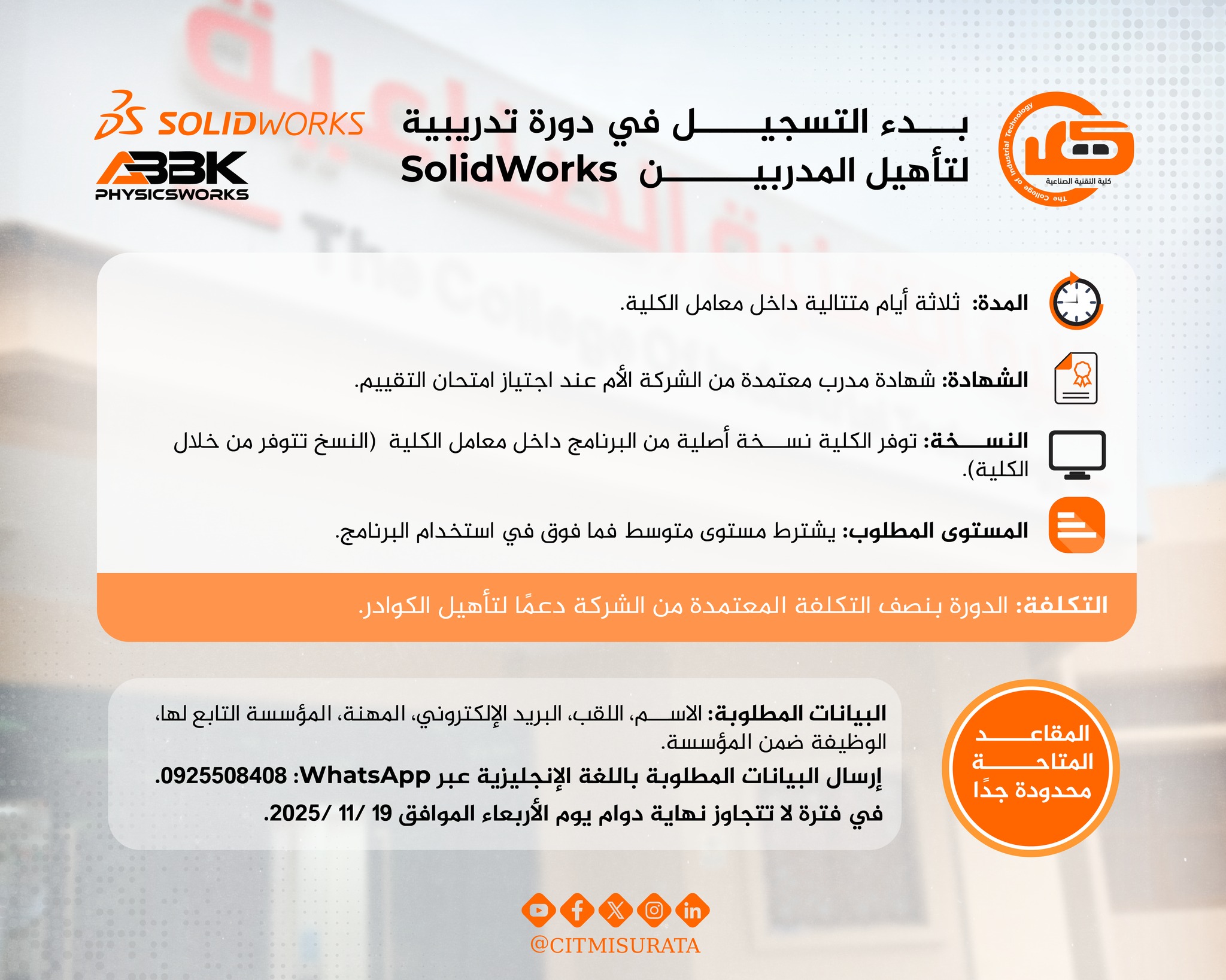 تُعلن كلية التقنية الصناعية – مصراتة عن إطلاق دورة تدريبية متخصصة لتأهيل مدربين في برنامج التصميم ثلاثي الأبعاد (SolidWorks)، بإشراف مدربين معتمدين من شركة ABBK Physics Works – تونس، الوكيل الرسمي لشركة SolidWorks. معلومات عن الدورة: • تُقام الدورة داخل معامل كلية التقنية الصناعية ولمدة 3 أيام متتالية. • يتحصل المتدرب على شهادة مدرب معتمدة من الشركة الأم بعد اجتياز اختبار التقييم في نهاية الدورة. • يحصل المتدرب على نسخة أصلية من البرنامج داخل معامل الكلية تُمنح من خلال الكلية. • يشترط أن يكون المتقدم ذا خبرة متوسطة أو أعلى في استخدام البرنامج. • للتقديم، يُرجى التواصل عبر WhatsApp مع مدير مركز الريادة وحاضنات الأعمال: 0925508408. • تقدَّم الدورة بنصف القيمة المعتمدة من الشركة دعمًا لبناء القدرات وتأهيل الكوادر المتخصصة. • على الراغبين في التقدّم إرسال بياناتهم باللغة الإنجليزية: (الاسم – اللقب – البريد الإلكتروني – المهنة – جهة العمل – الوظيفة داخل الجهة). • آخر موعد لاستلام البيانات: نهاية دوام يوم الأربعاء الموافق 19 / 11 / 2025م. • المقاعد المتاحة محدودة جدًا.