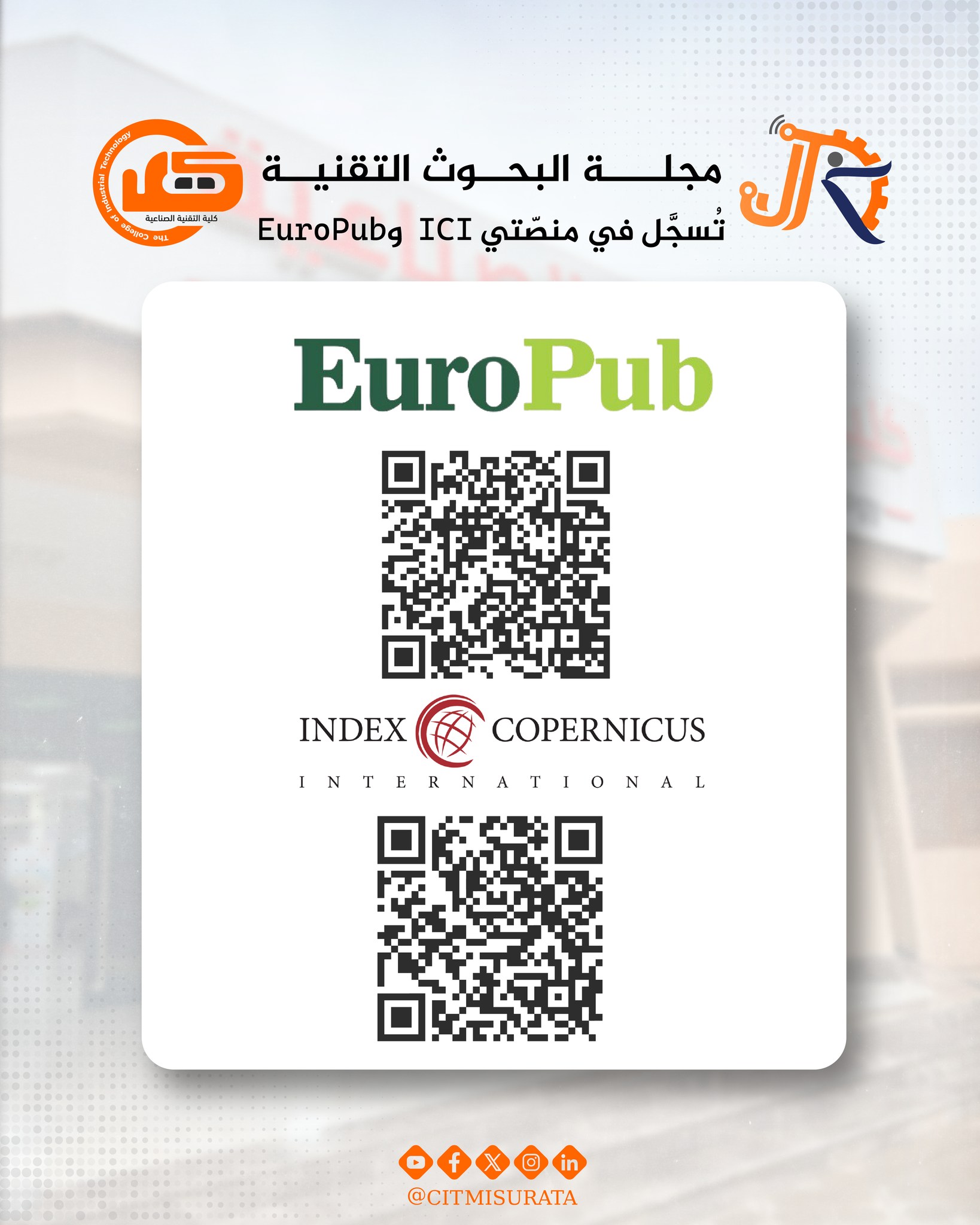 في إطار جهود كلية التقنية الصناعية – مصراتة للارتقاء بمستوى النشر العلمي، تم تسجيل مجلة البحوث التقنية ضمن قواعد البيانات الدولية ICI World of Journals وEuroPub، حيث أُدرجت جميع الأبحاث المنشورة في المجلدين الأول والثاني بكلا عدديهما.